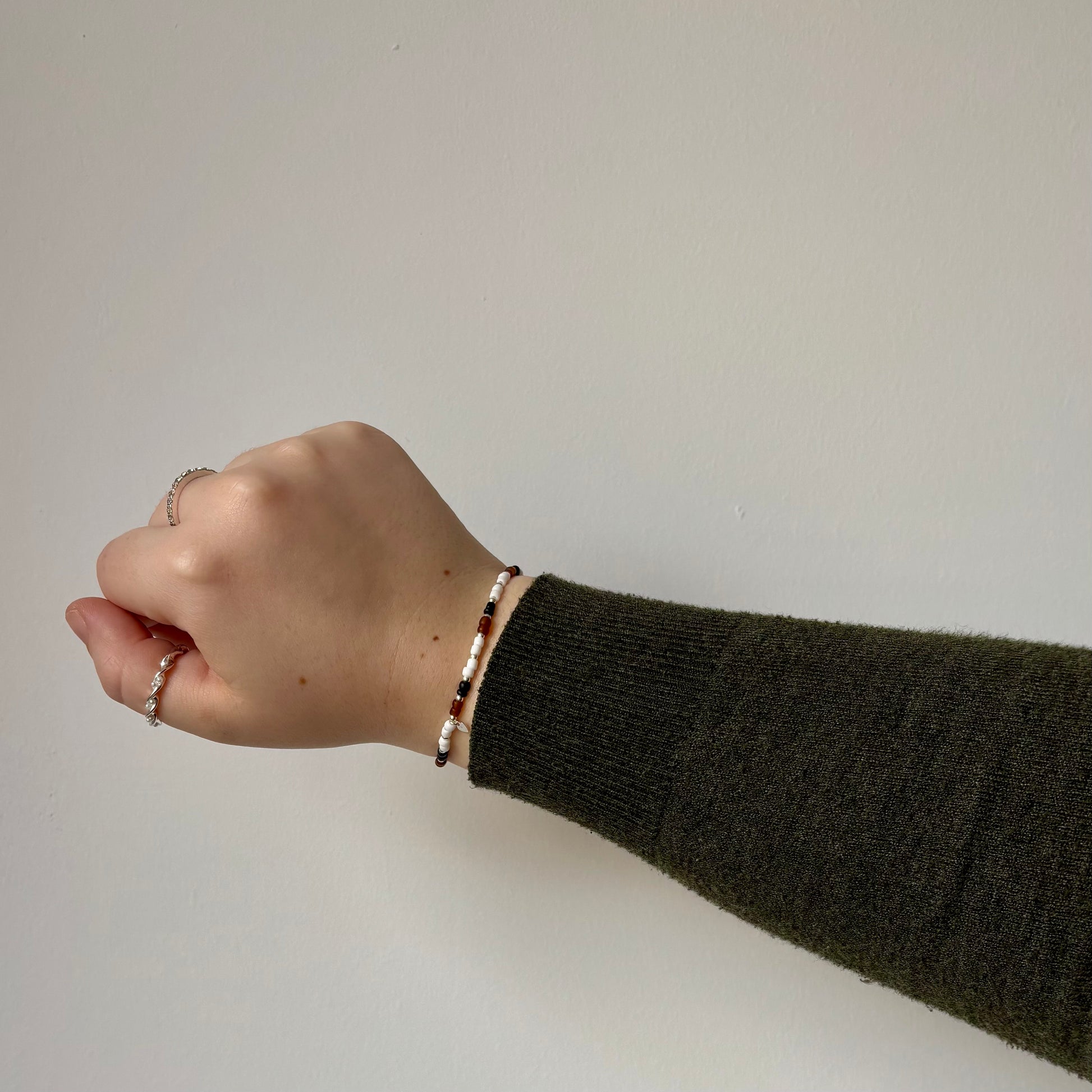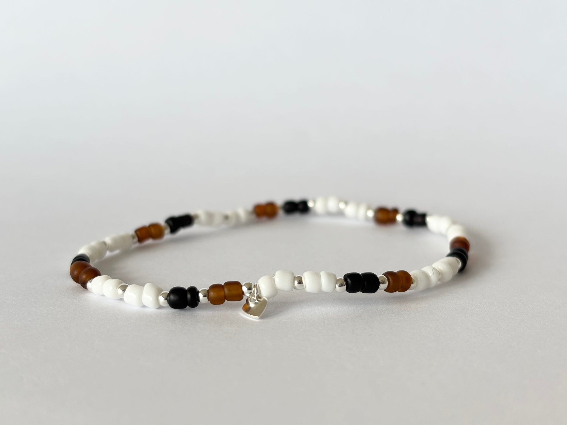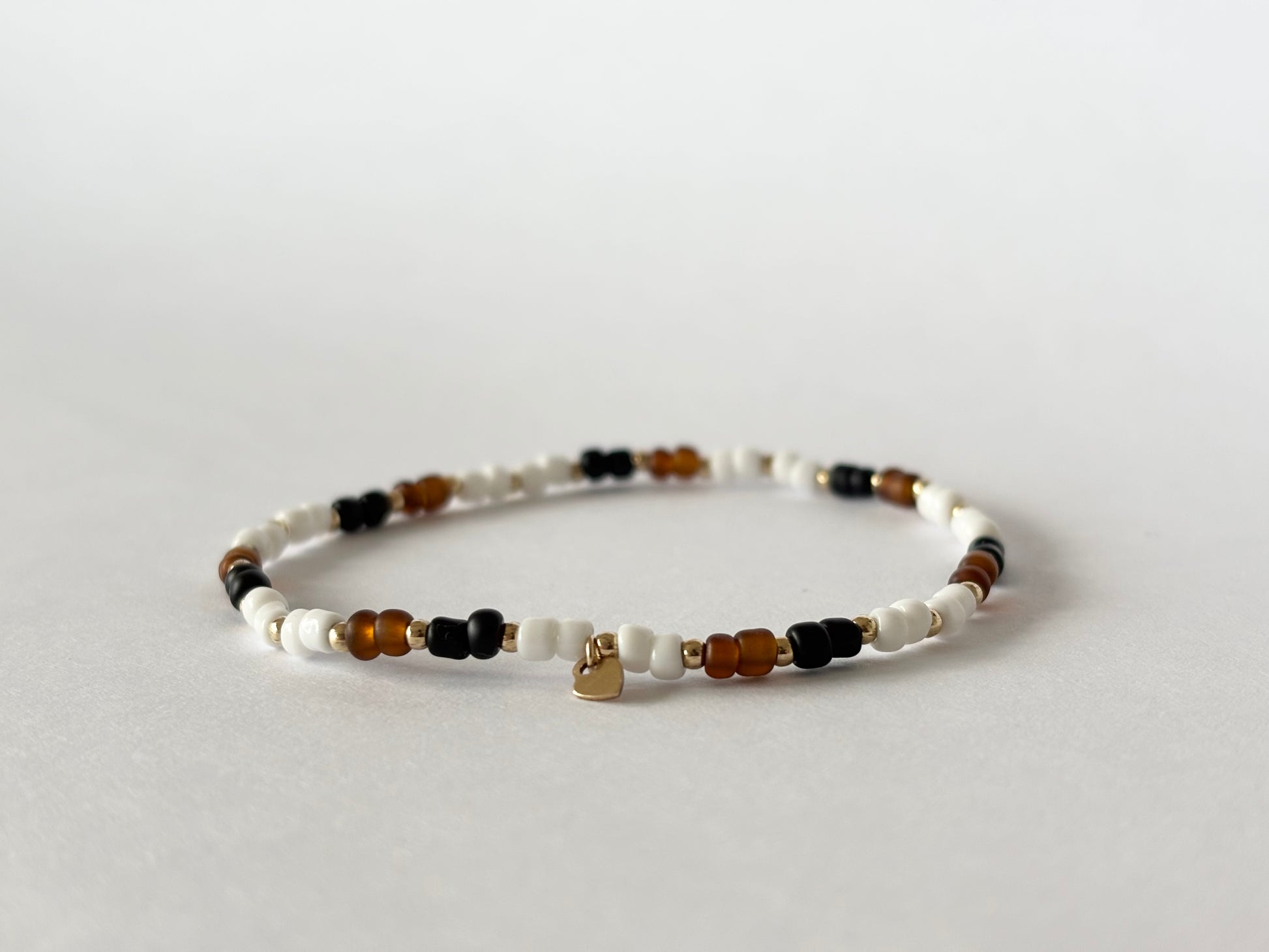 3mm colour seed beads on elasticated string with gold filled/sterling silver 2mm beads & heart charm. Bracelet is approx 6cm in diameter.