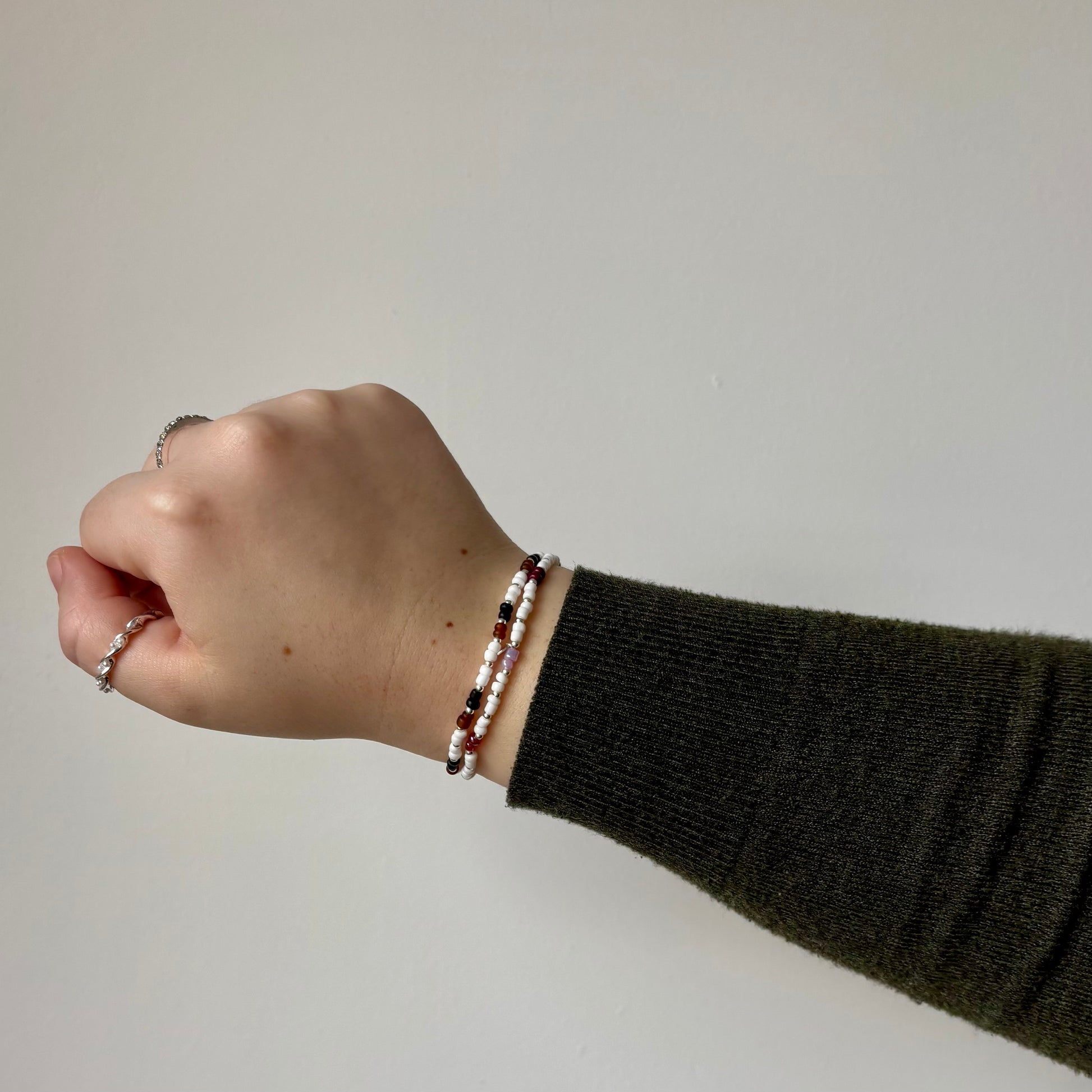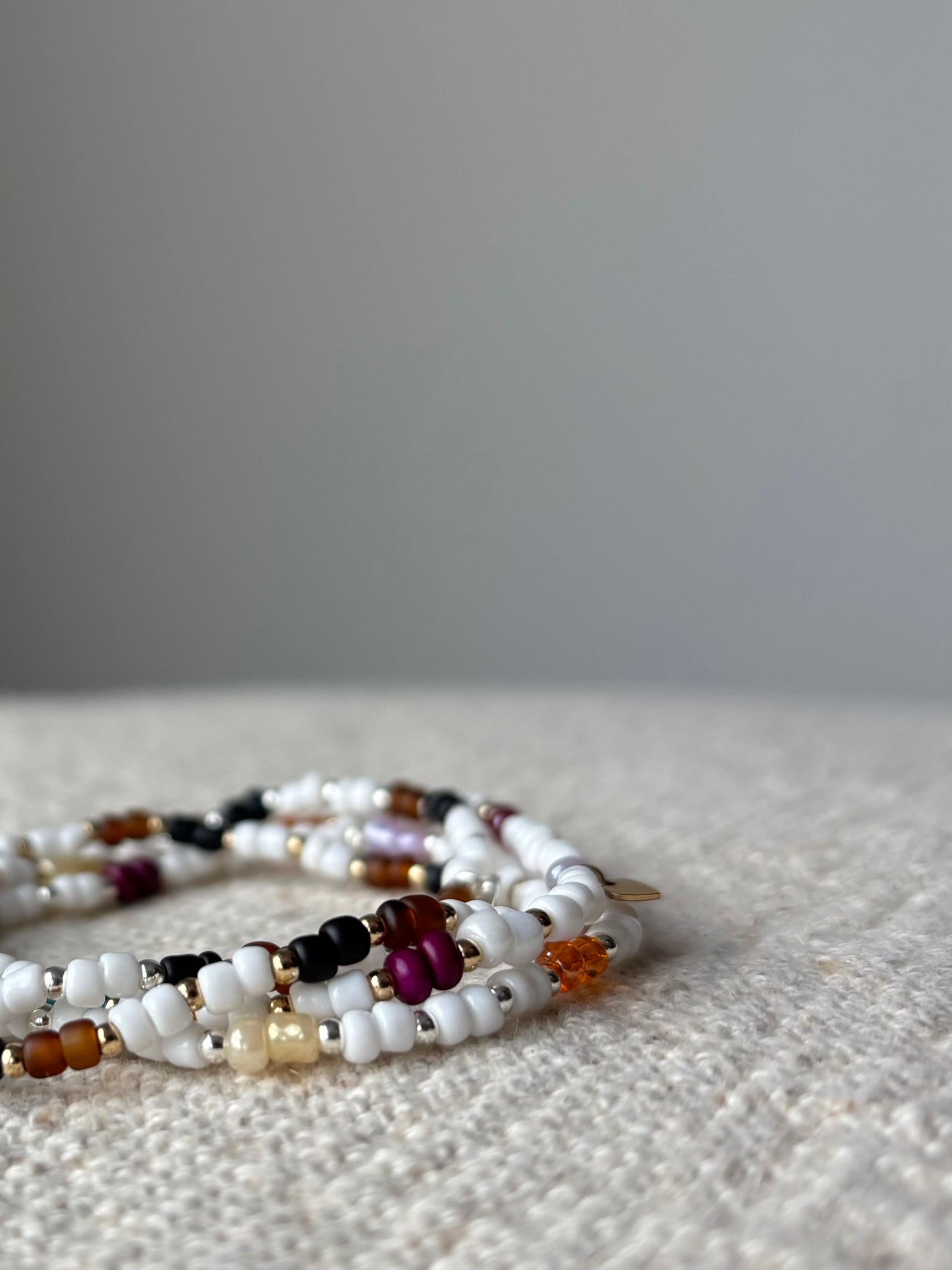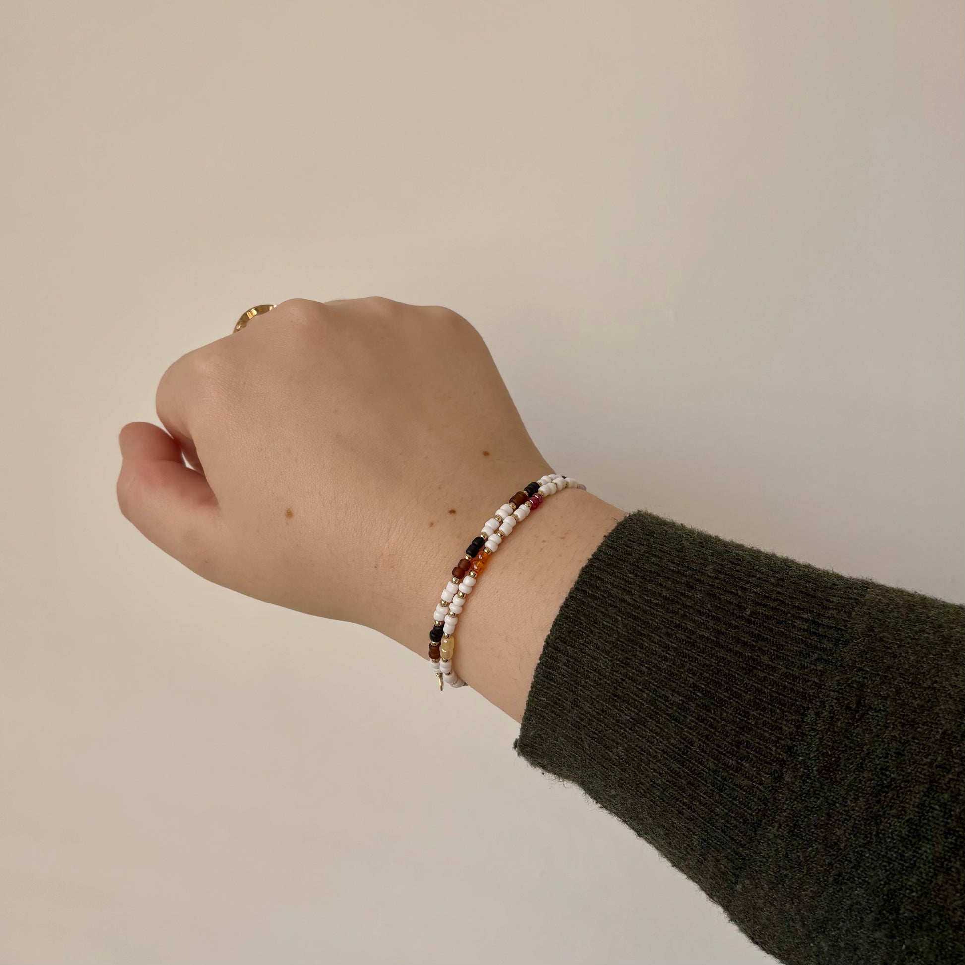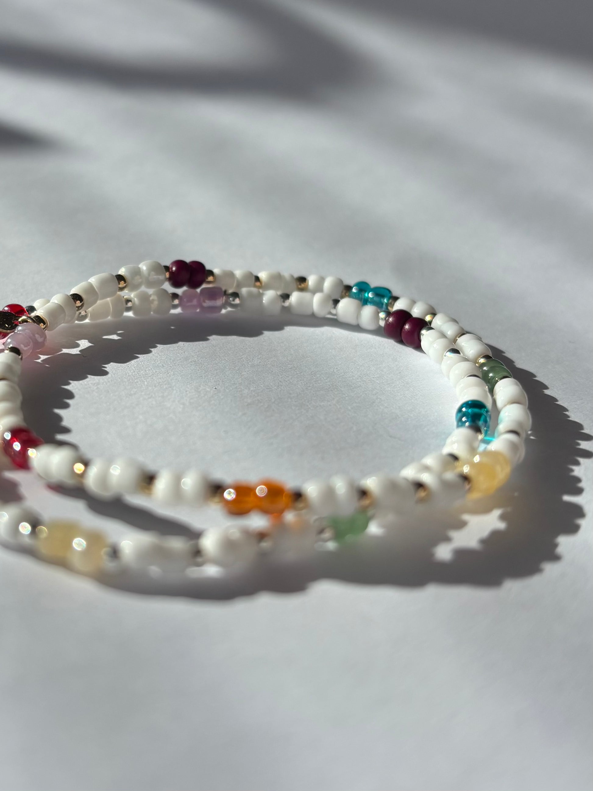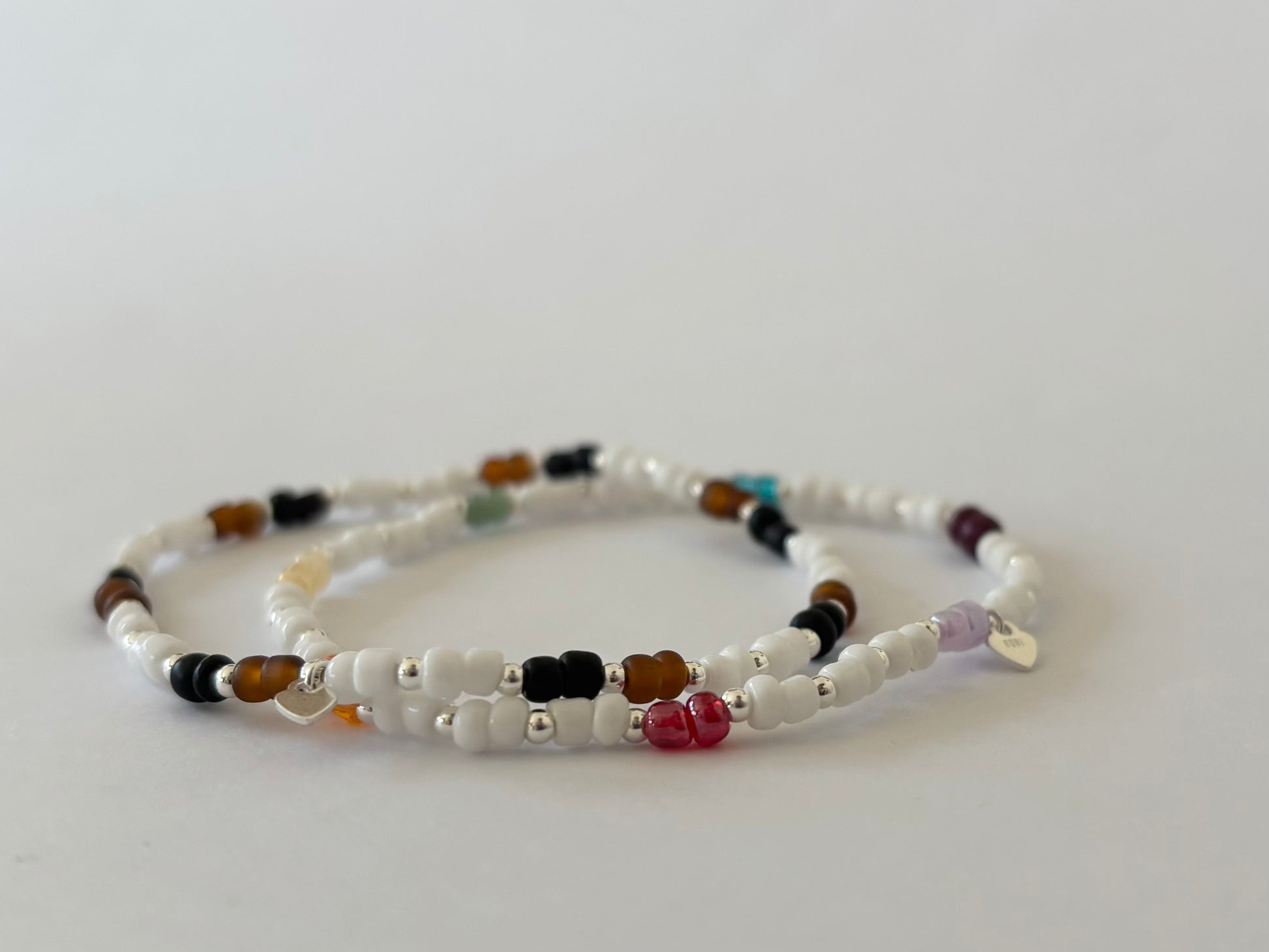 3mm colour seed beads on elasticated string with gold filled/sterling silver 2mm beads & heart charm. Bracelet is approx 6cm in diameter.