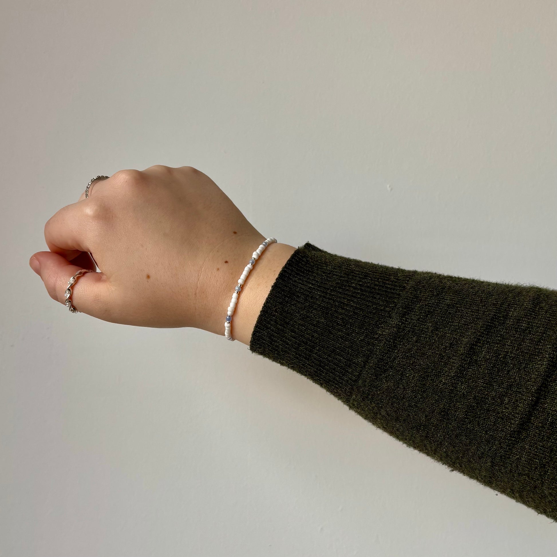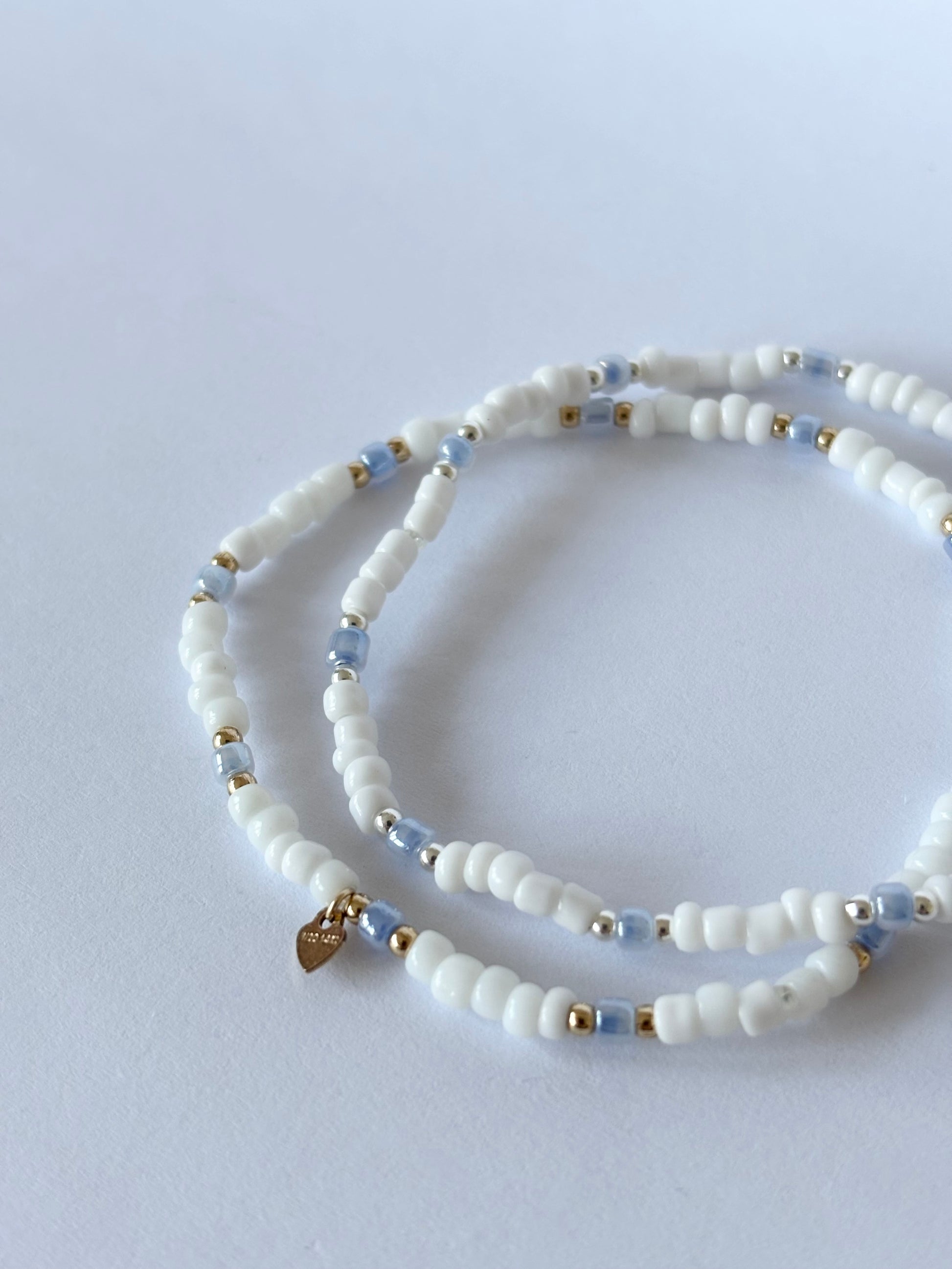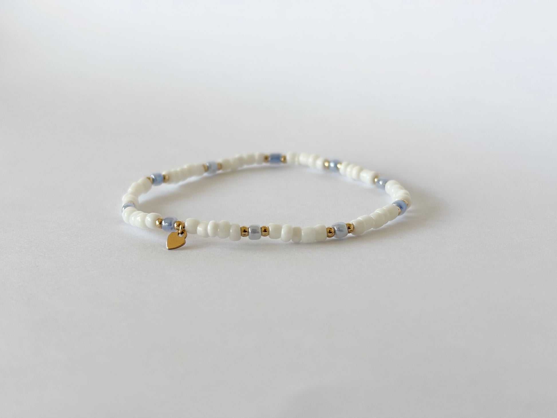 3mm colour seed beads on elasticated string with gold filled/sterling silver 2mm beads & heart charm. Bracelet is approx 6cm in diameter.