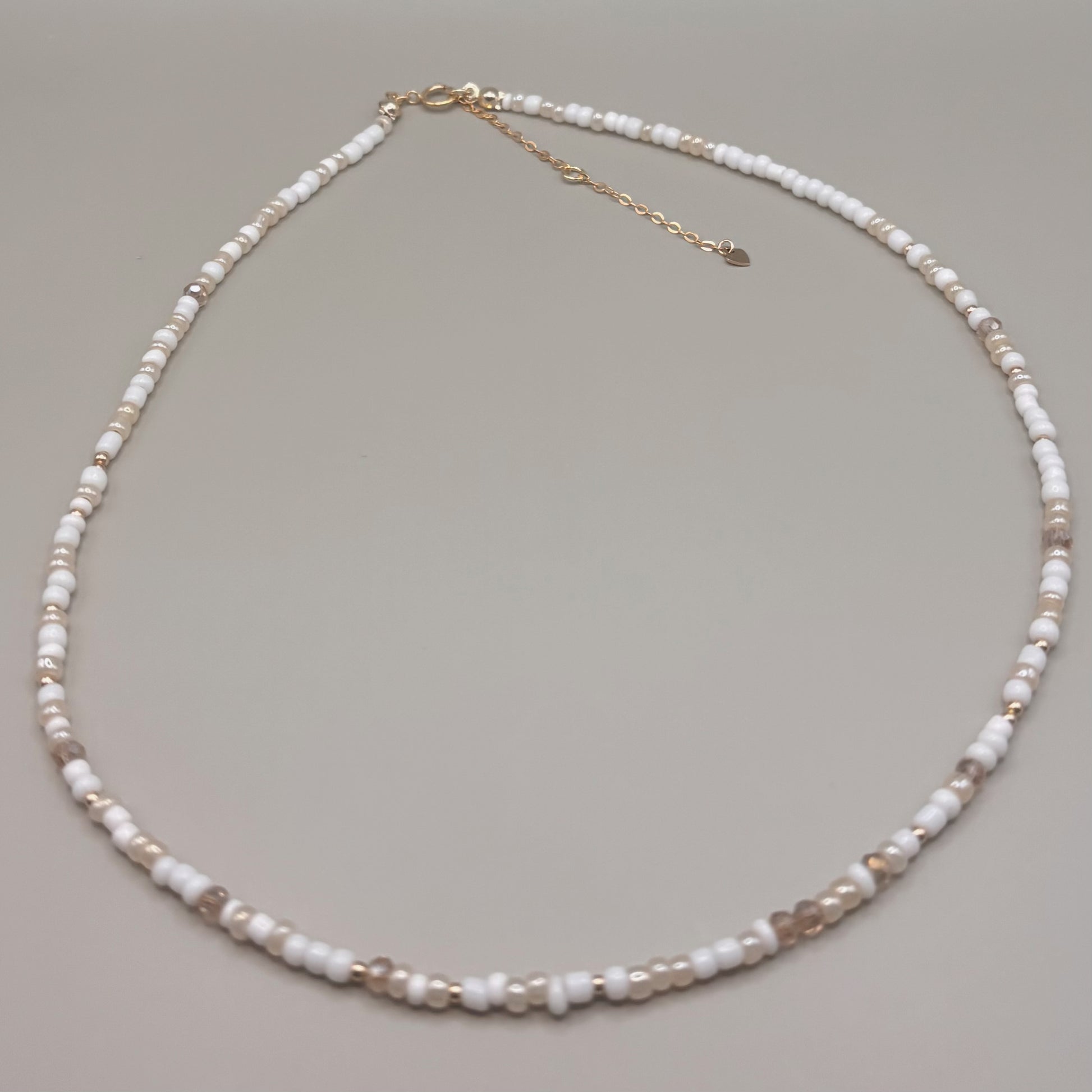 3mm colour seed beads on elasticated string with gold filled/sterling silver 2mm beads & heart charm. Bracelet is approx 6cm in diameter.