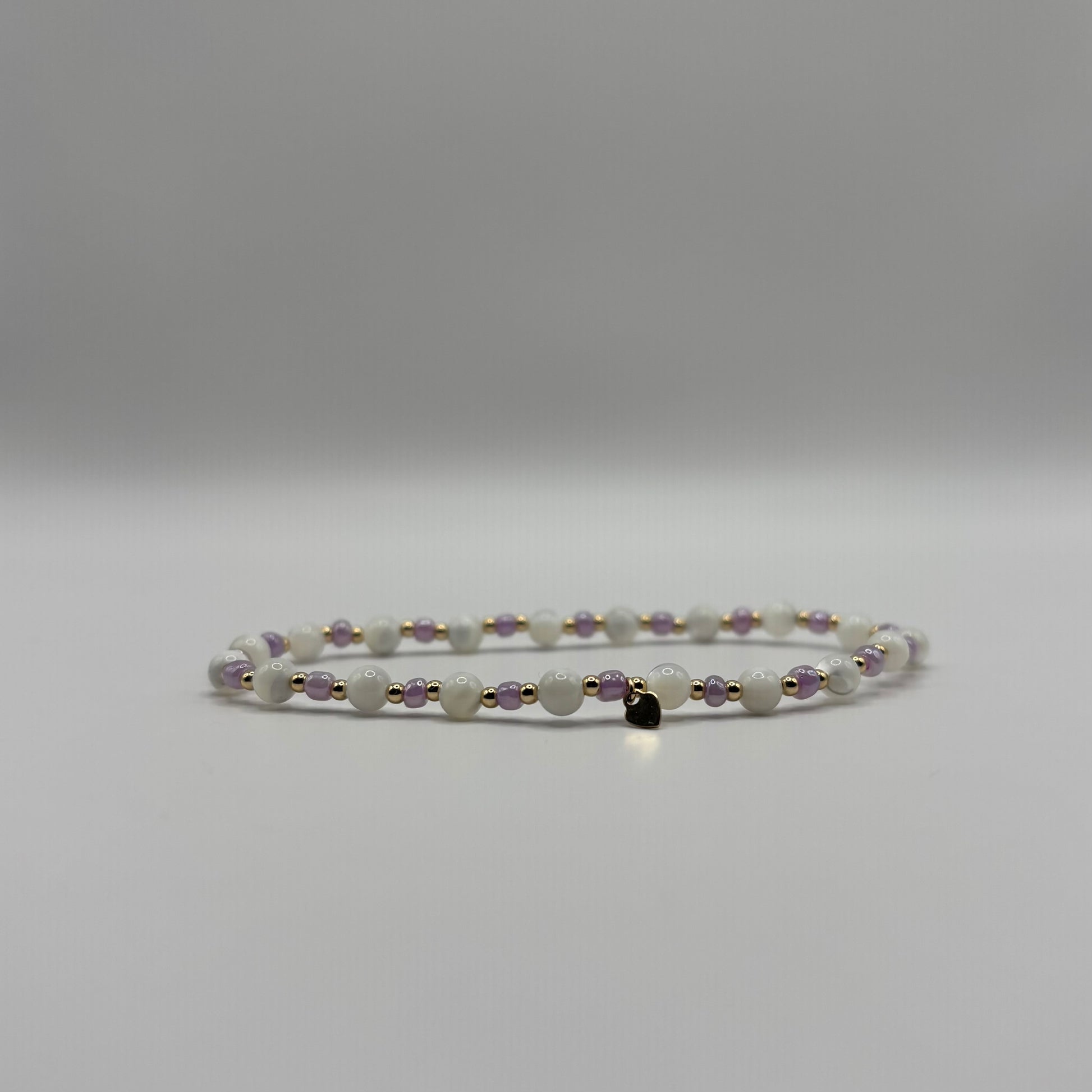 3mm colour seed beads on elasticated string with gold filled/sterling silver 2mm beads & heart charm. Bracelet is approx 6cm in diameter.