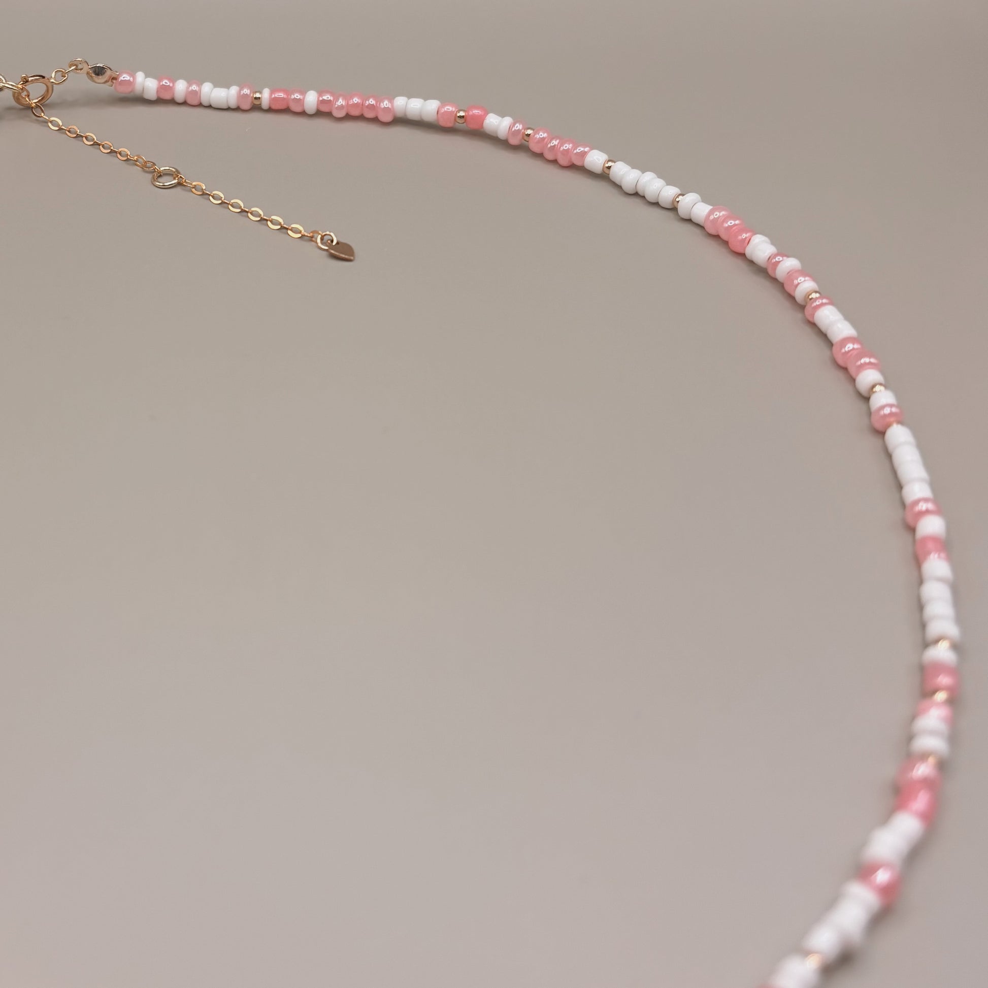3mm colour seed beads on elasticated string with gold filled/sterling silver 2mm beads & heart charm. Bracelet is approx 6cm in diameter.