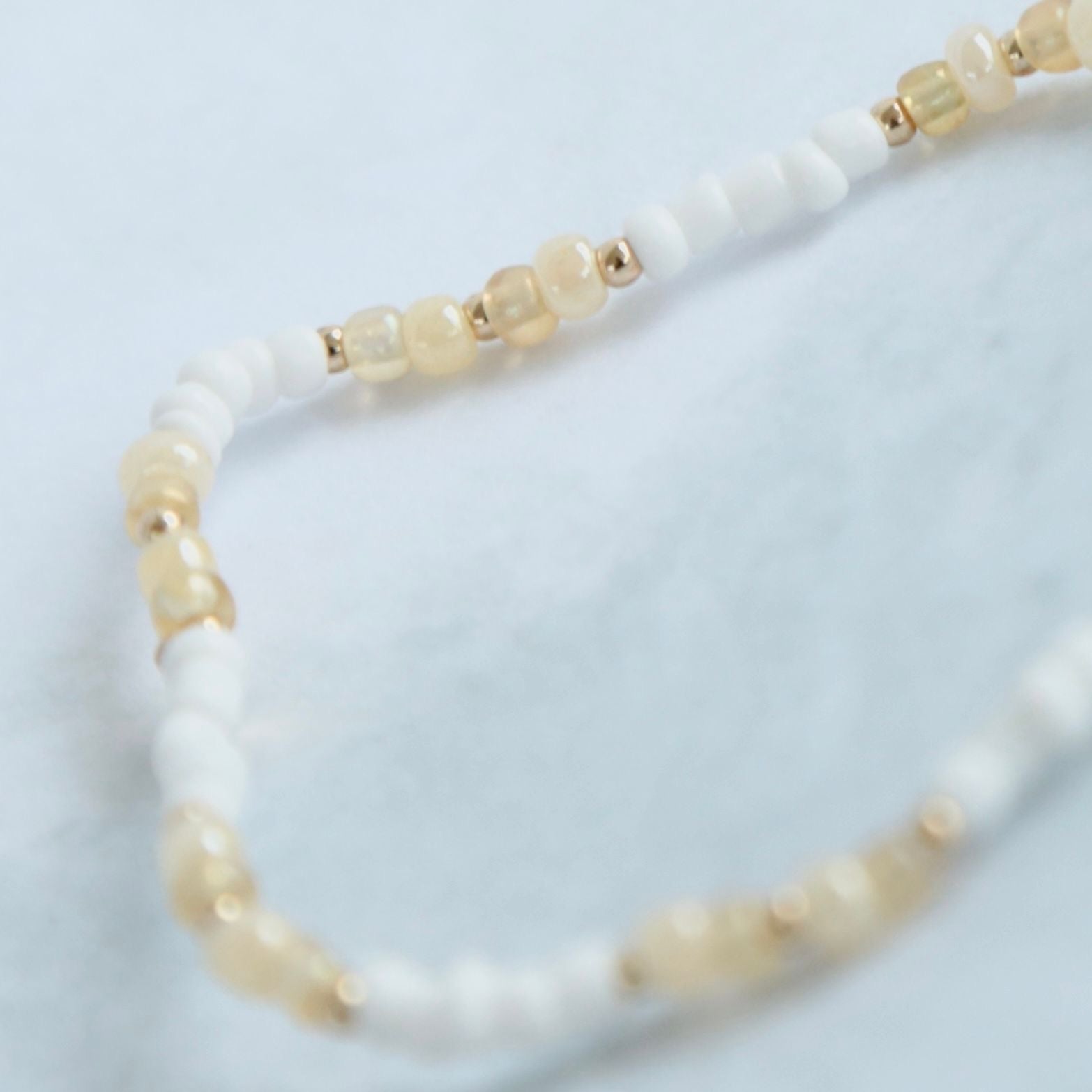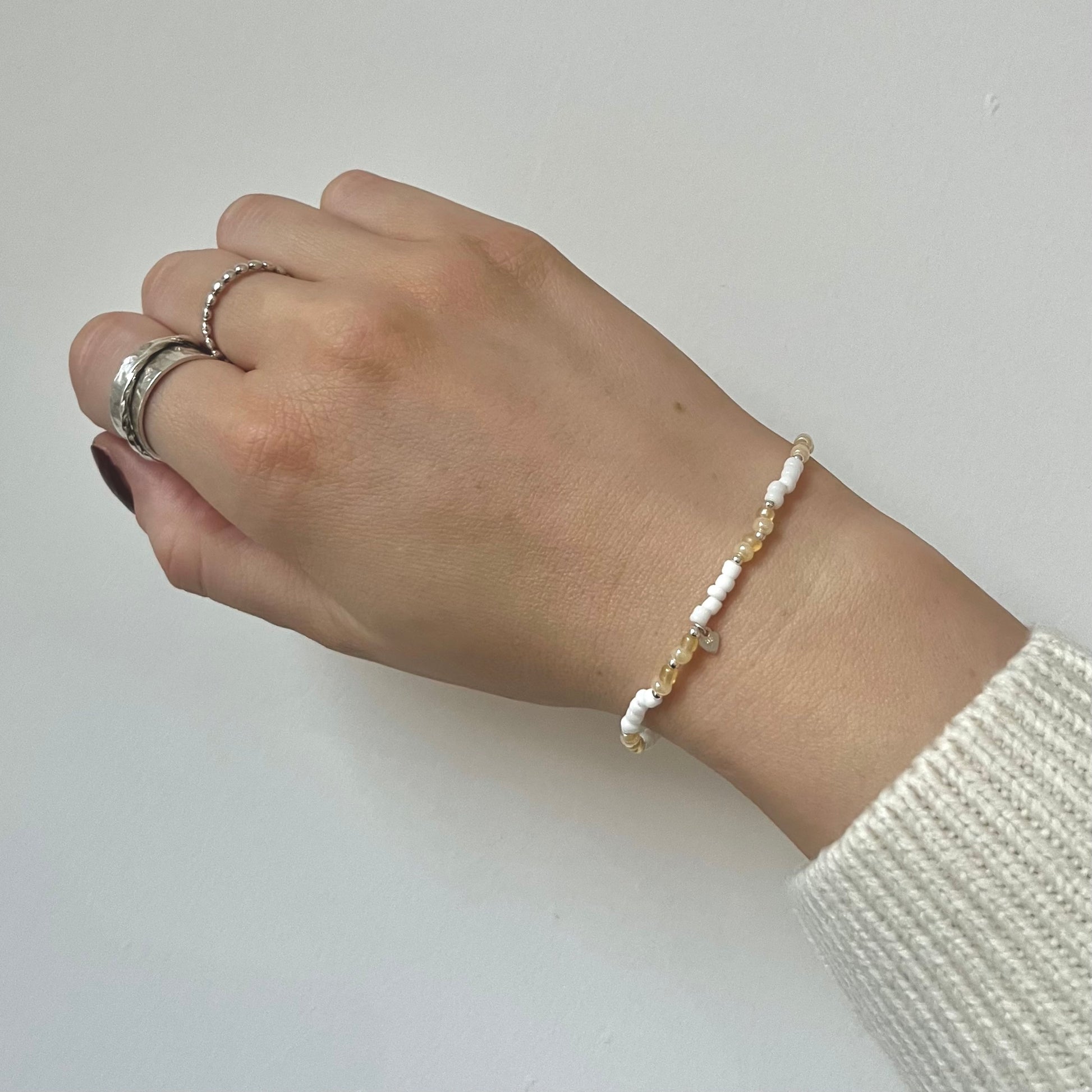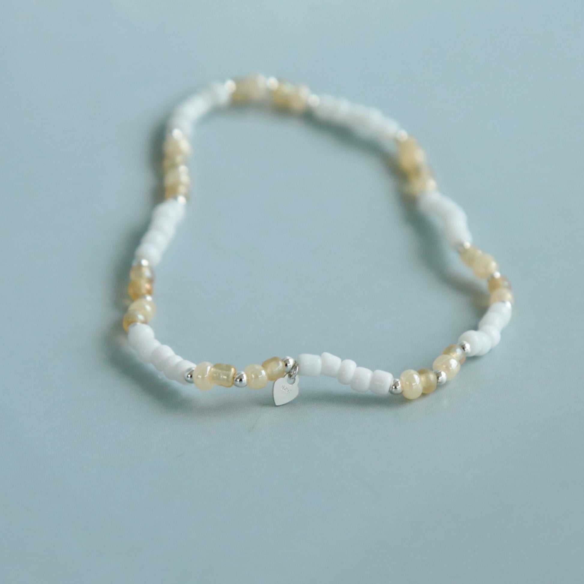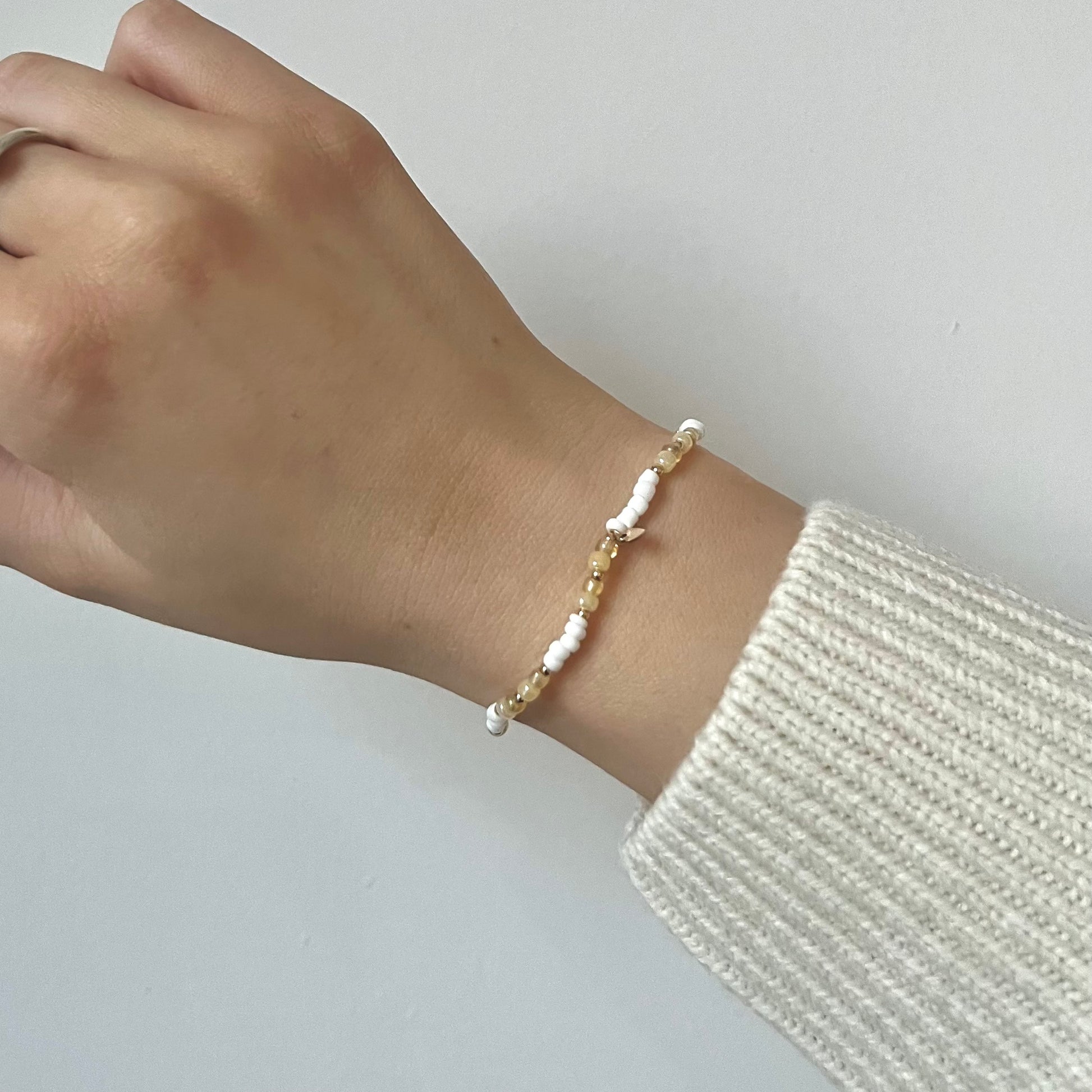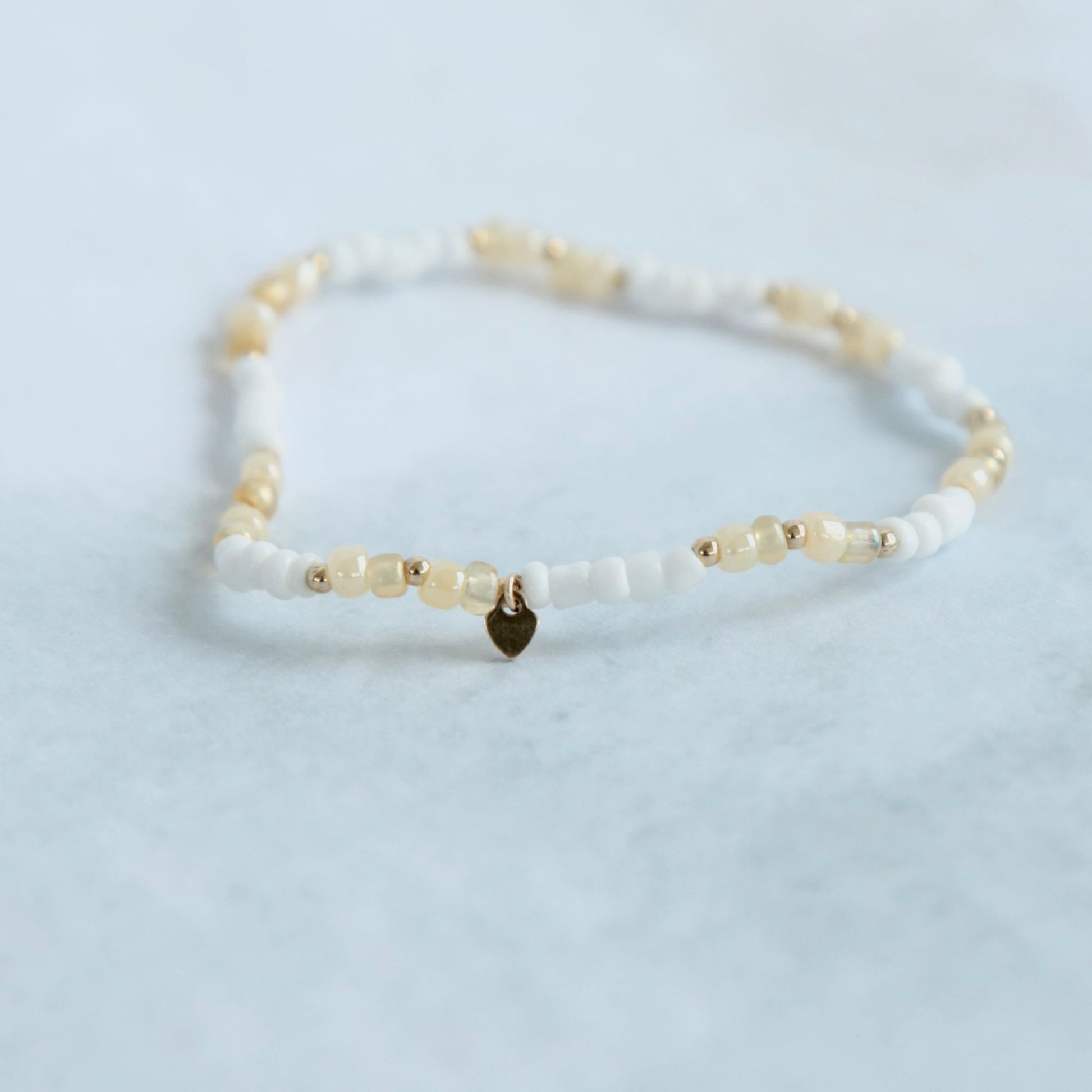 3mm colour seed beads on elasticated string with gold filled/sterling silver 2mm beads & heart charm. Bracelet is approx 6cm in diameter.