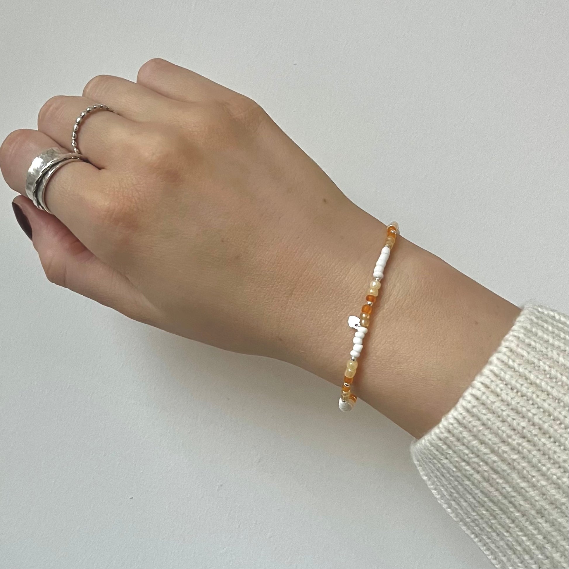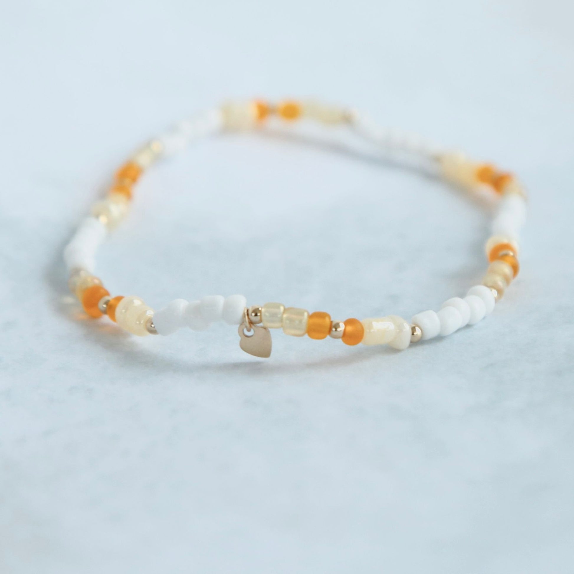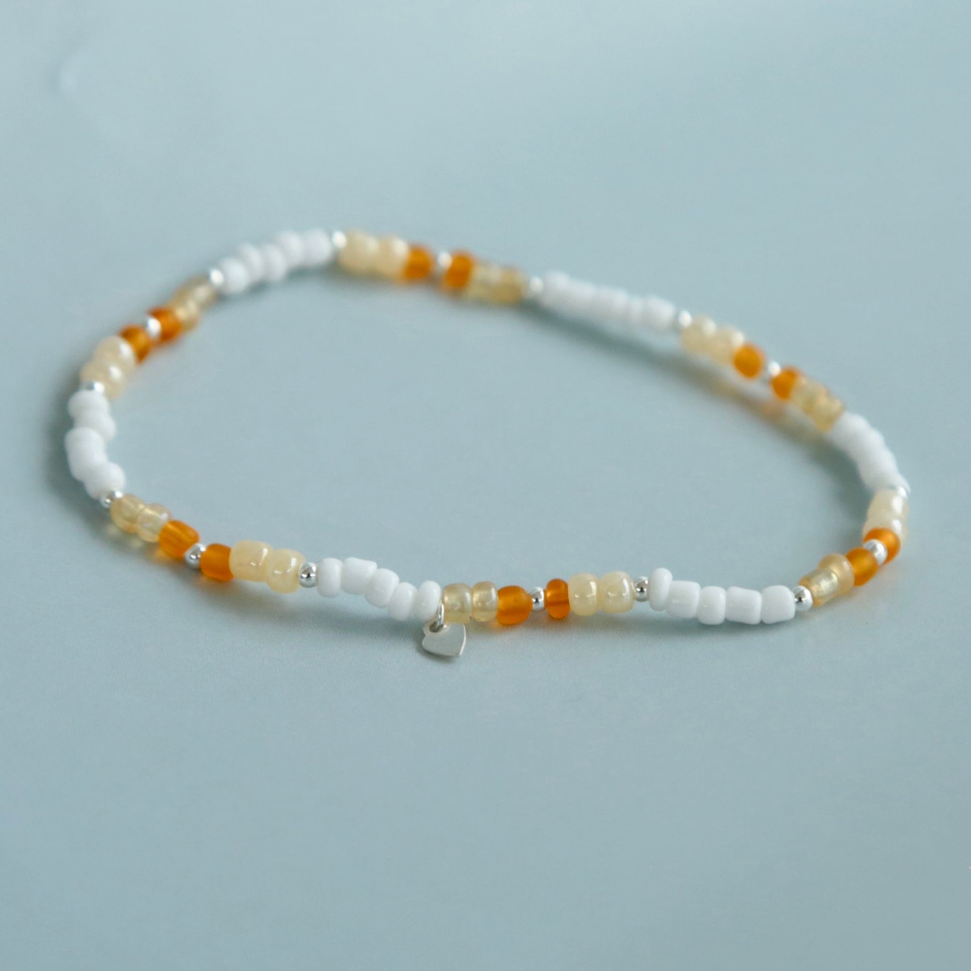 3mm colour seed beads on elasticated string with gold filled/sterling silver 2mm beads & heart charm. Bracelet is approx 6cm in diameter.