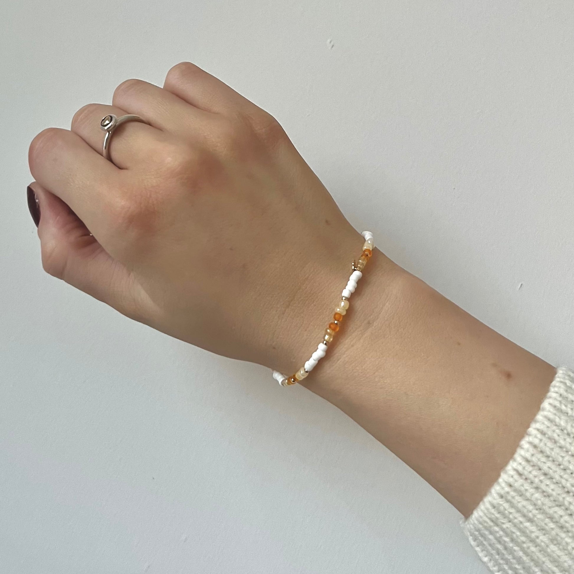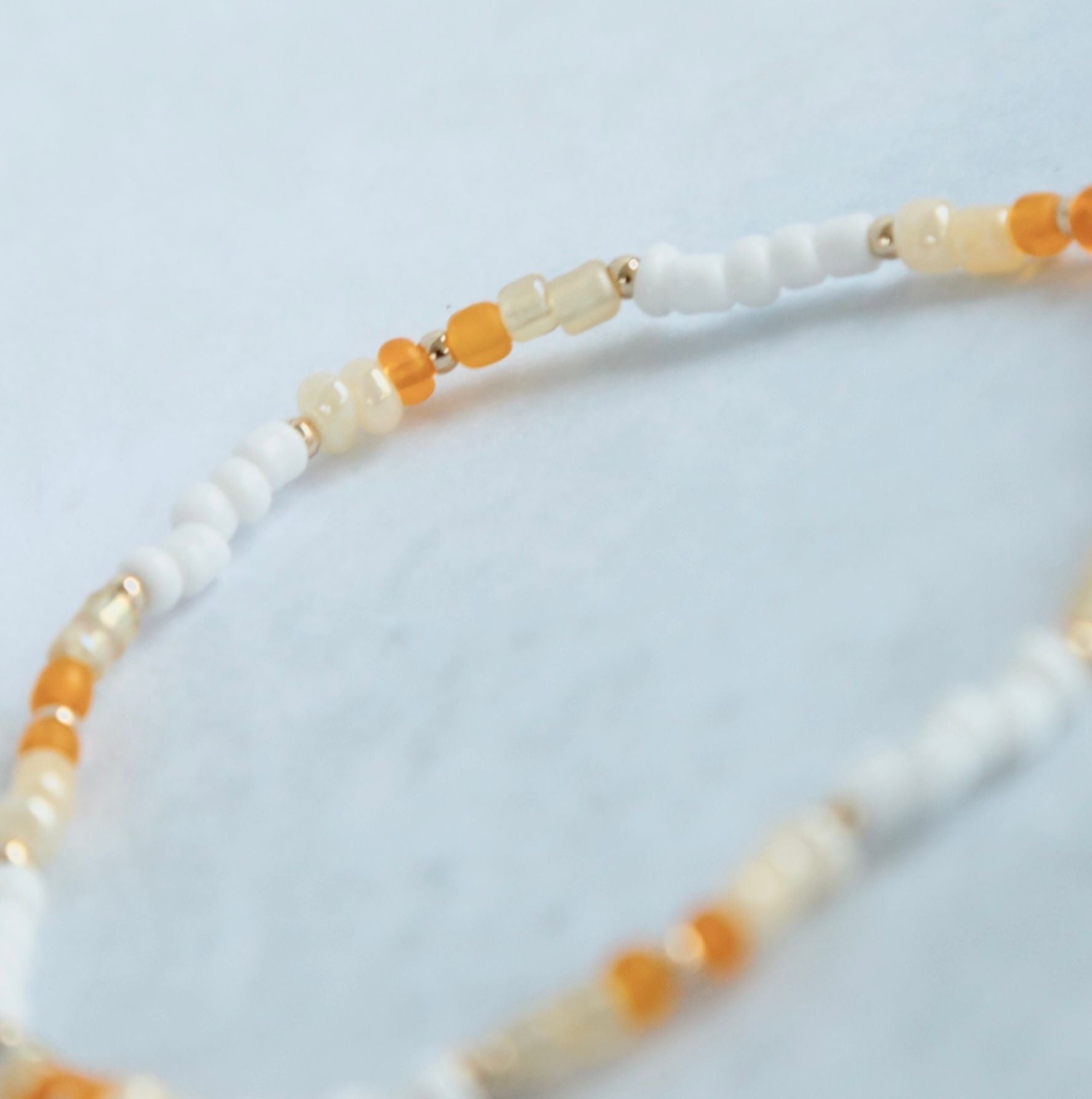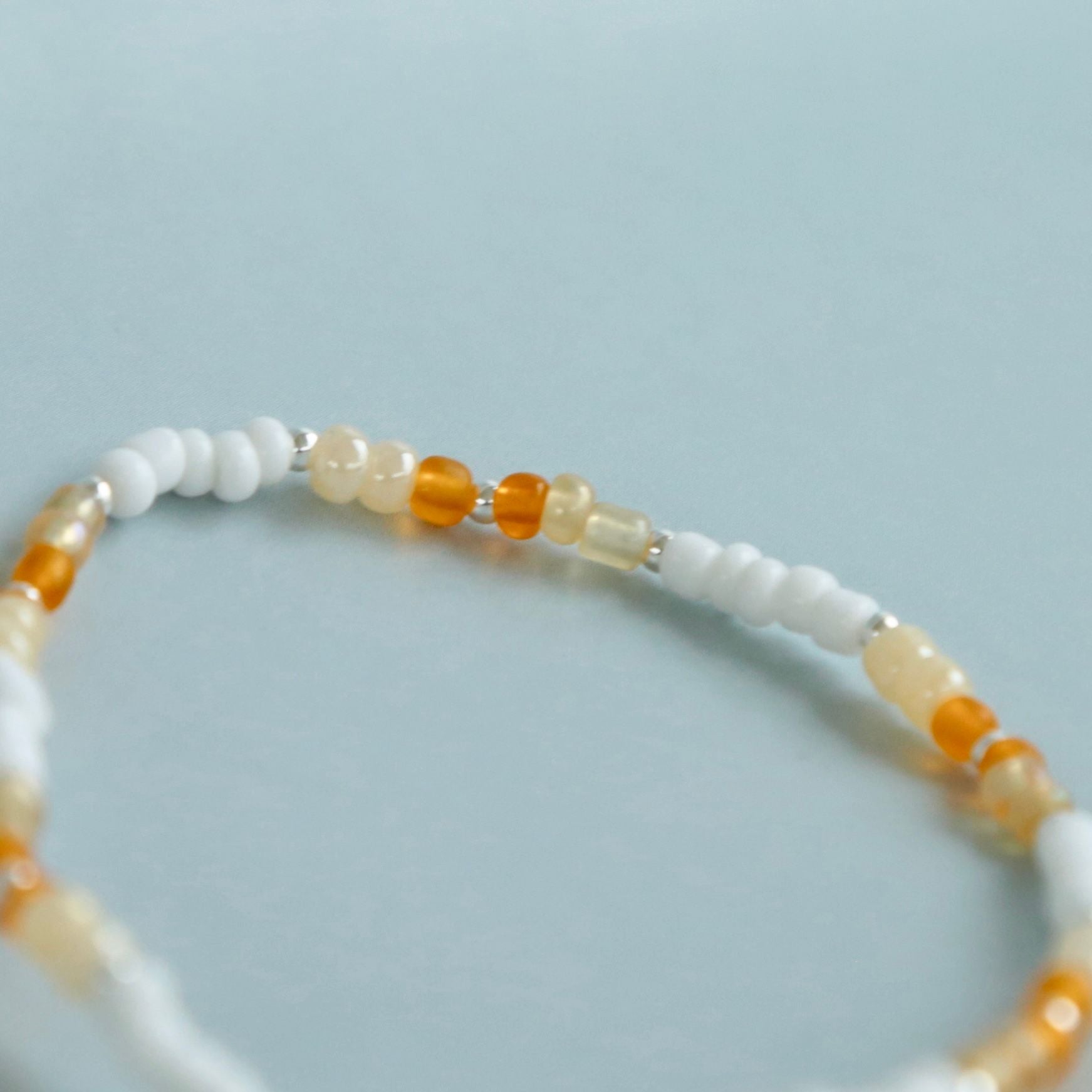 3mm colour seed beads on elasticated string with gold filled/sterling silver 2mm beads & heart charm. Bracelet is approx 6cm in diameter.