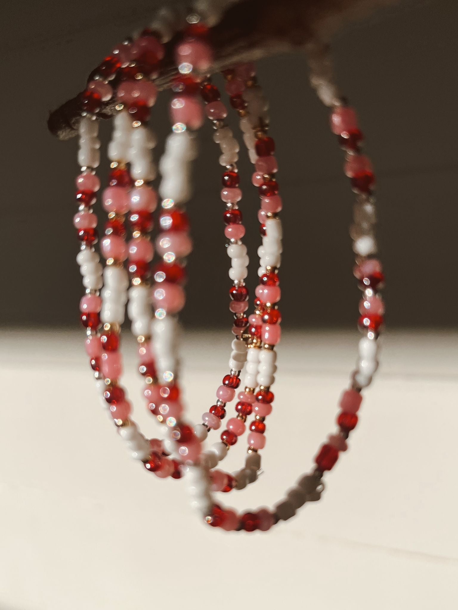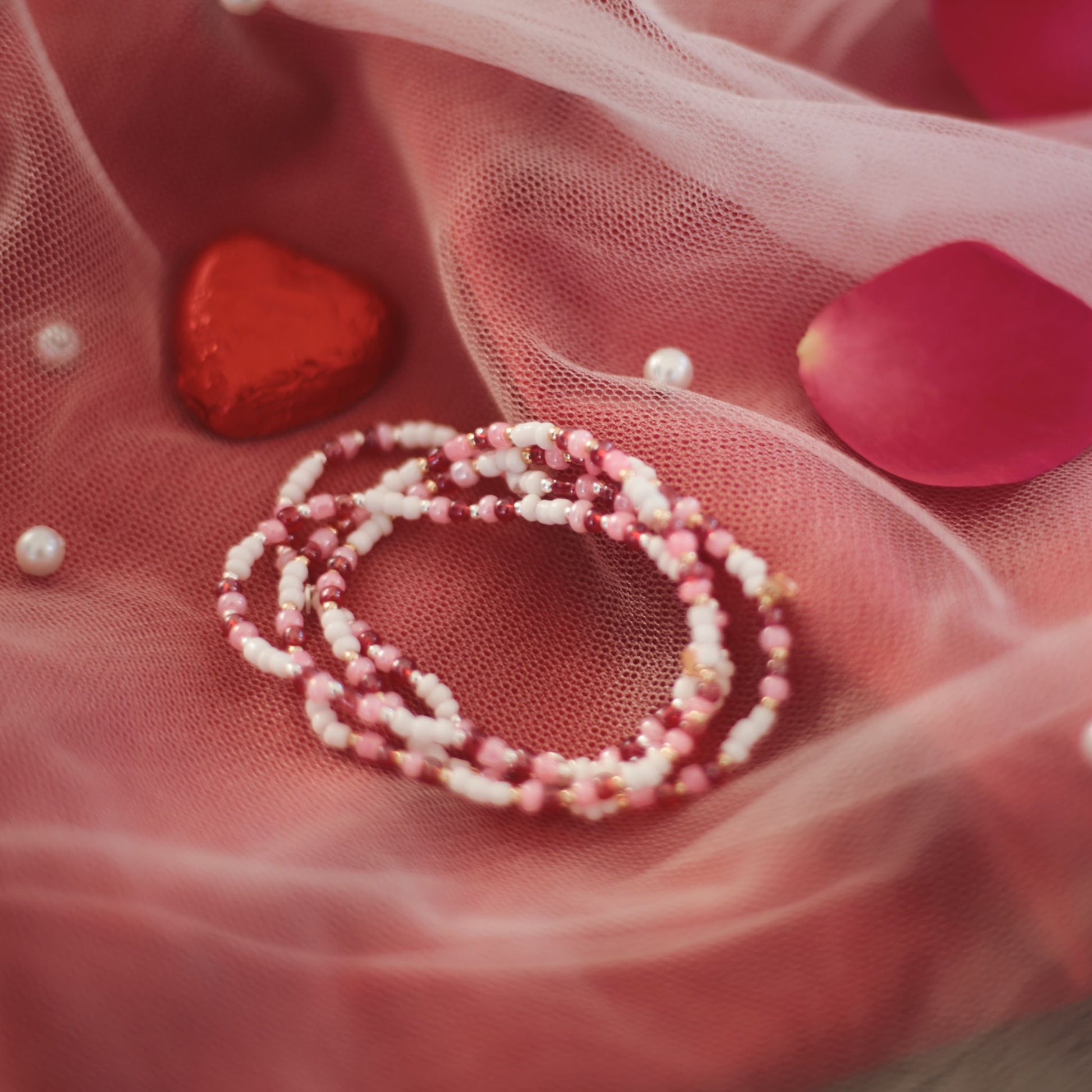 3mm colour seed beads on elasticated string with gold filled/sterling silver 2mm beads & heart charm. Bracelet is approx 6cm in diameter.