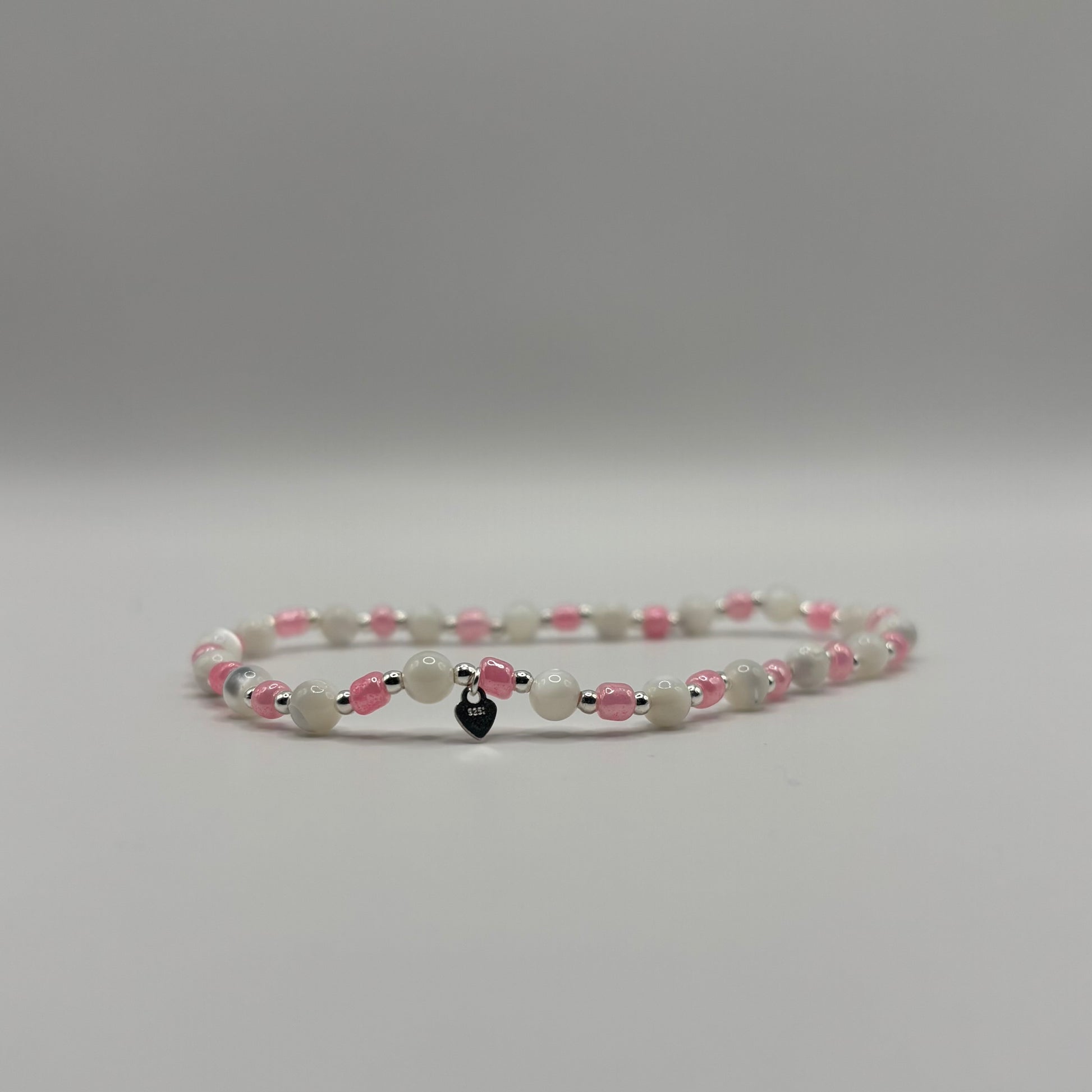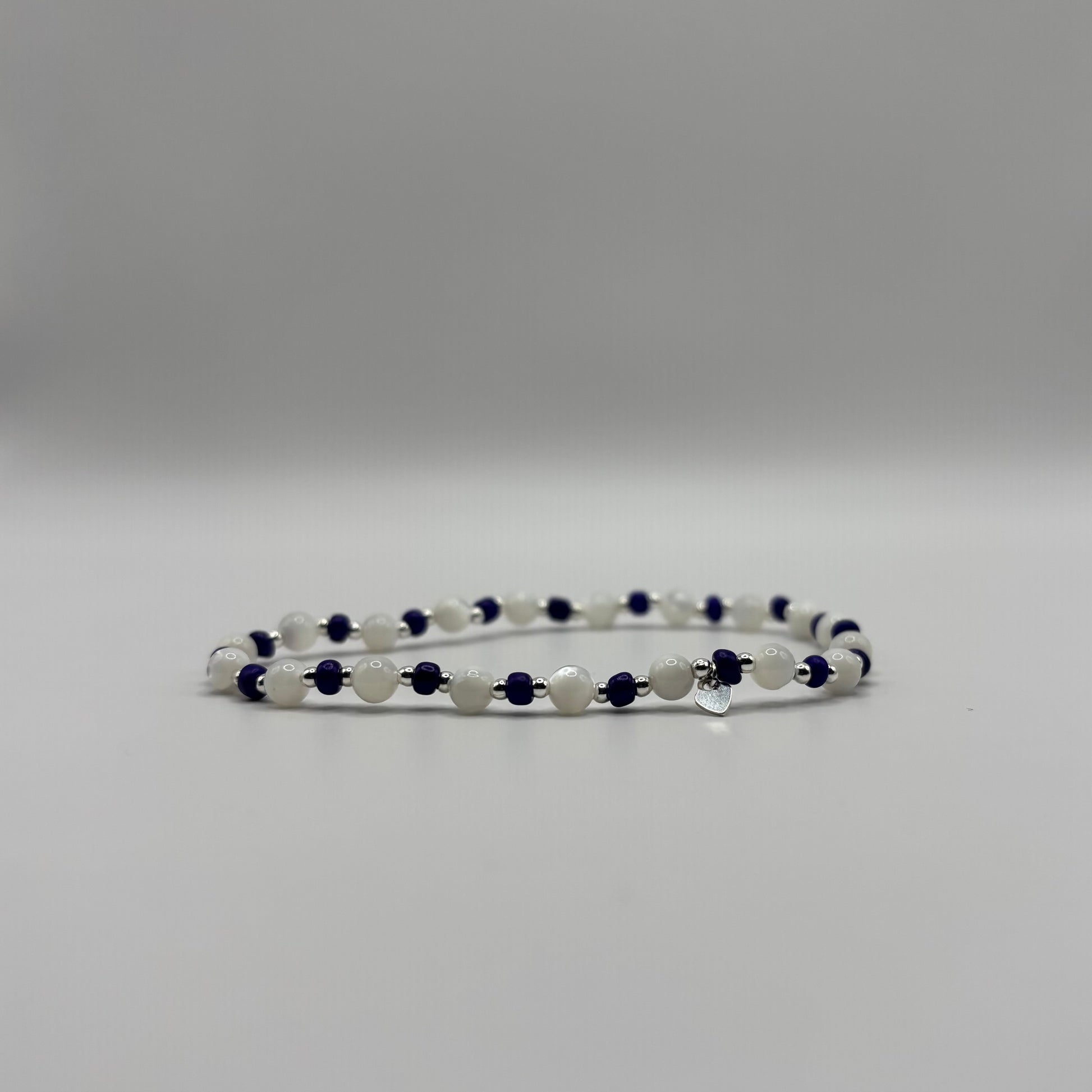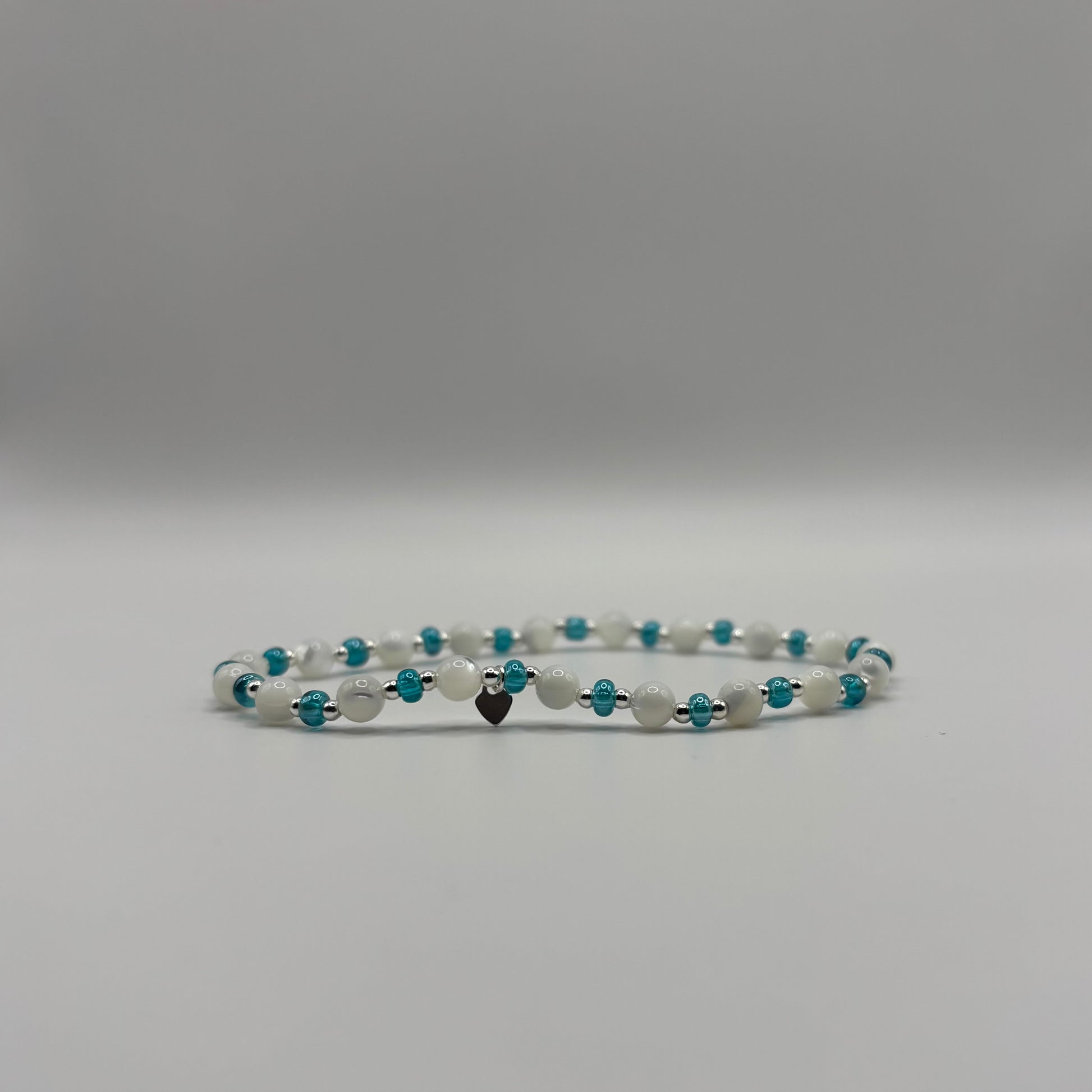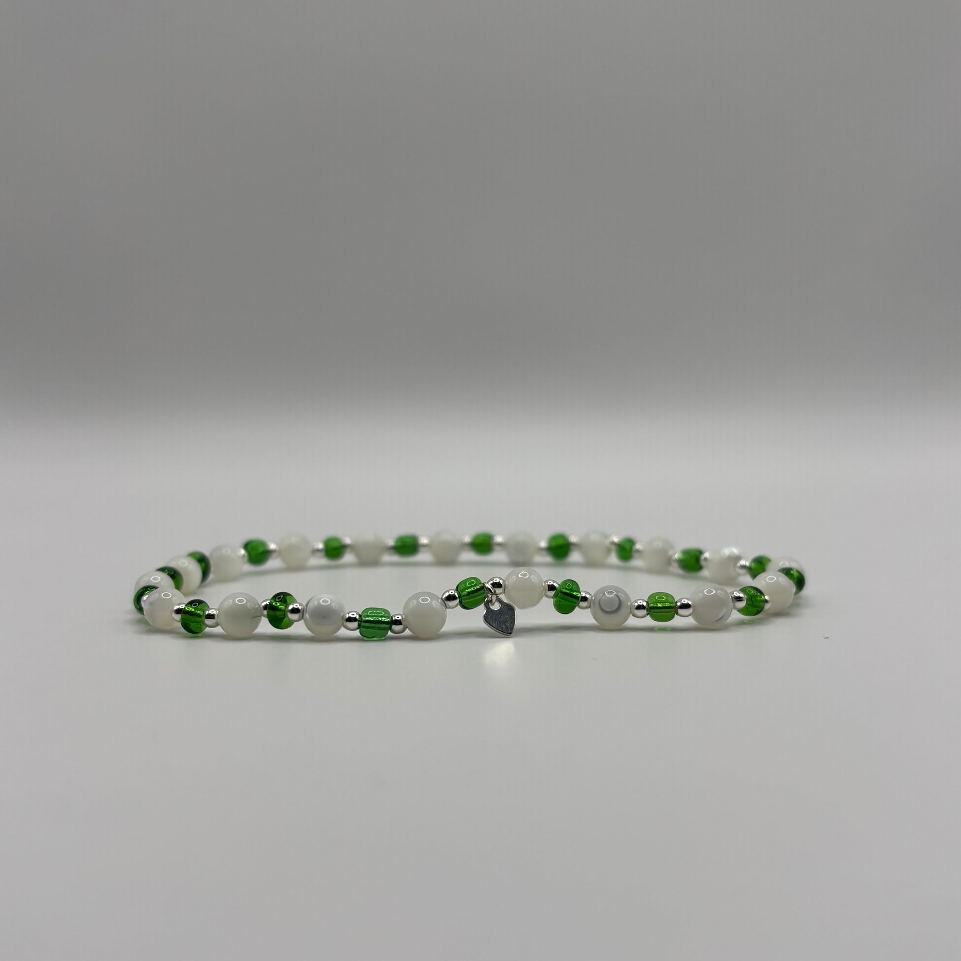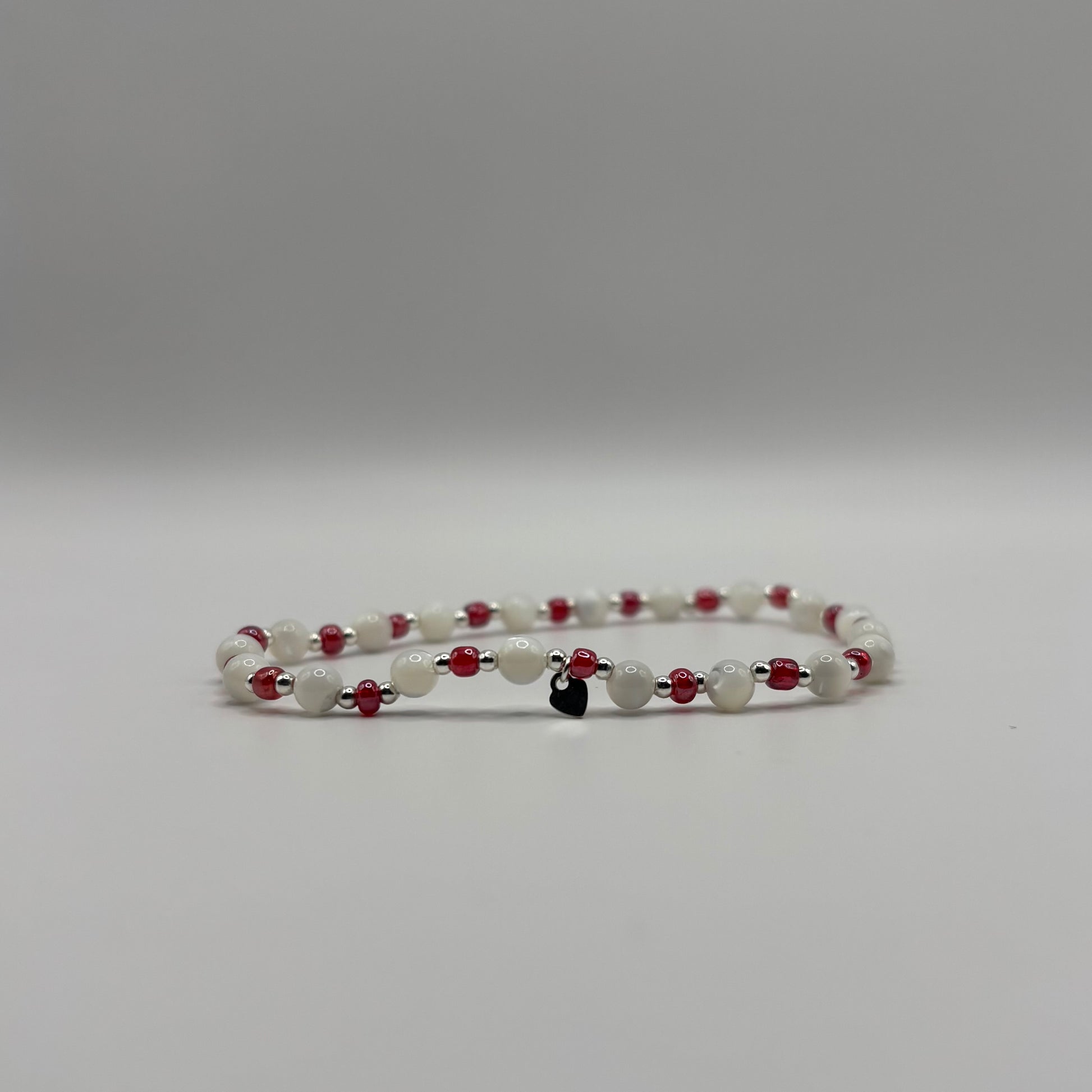3mm colour seed beads on elasticated string with gold filled/sterling silver 2mm beads & heart charm. Bracelet is approx 6cm in diameter.